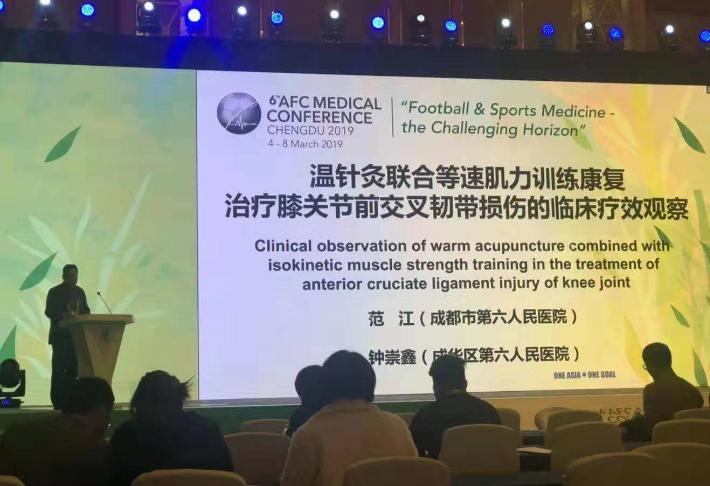 会议以“⾜球与运动医学——挑战与 机遇”为主题,邀请了来⾃国际⾜联、欧⾜联、亚⾜联的专业⼈⼠和来⾃欧洲、美洲、⼤洋洲、⾮洲的专家学者,与中国知名运动医学专家们展开专业分享交流。李伟主任就《下胫腓前韧带损伤不同治疗策略的疗效》、范江主任就《温针灸联合等速肌力训练康复治疗膝关节前交叉韧带损伤的临床疗效观察》做了专题演讲,可谓是中西合璧,大放异彩,在展示成都市第六人民医院学科能力的同时,展示了医院实力,获得了与会人员⾼度认可。